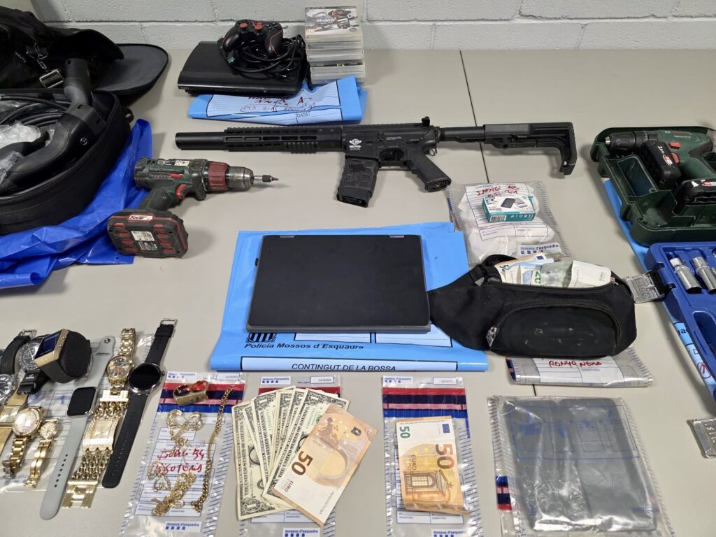Es va localitzar diverses eines com un martell pneumàtic, un trepant, una serra, diversos telèfons mòbils, un ordinador, una consola, una càmera de vídeo, un navegador, auriculars, rellotges, joies, 240 euros en efectiu i un subfusell d’aire comprimit. Quant a substàncies estupefaents es van intervenir una bossa de cabdells triturats de marihuana, bosses amb cocaïna, peces d’haixix i una bàscula de precisió.